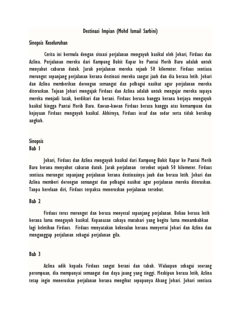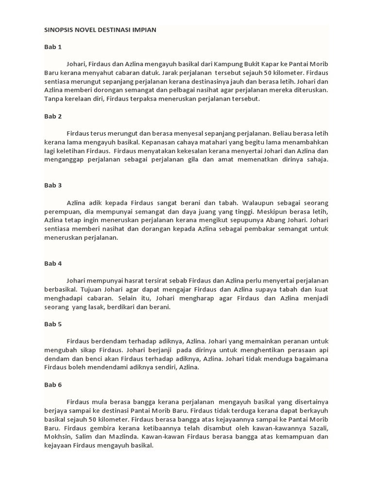 Sinopsis Novel Tingkatan 1 Sinopsis Novel Destinasi Impian Johari Azlina dan Firdaus telah menyahut cabaran datuk mereka untuk melakukan ekspedisi berbasikal dari Klang ke Morib. Firdaus seorang individu yang berada dalam keadaan dicabar dan mencabar. Program Bahasa Melayu Edubest - Analisis Novel SM1-1.