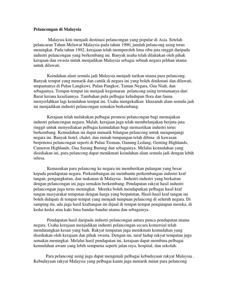 Para pelancong juga yakin untuk datang ke Malaysia kerana mereka tahu akan keselamatan mereka yang pasti terjamin. Seperti yang dinyatakanMalaysia negara yang bebas rusuhan walupun hidup berbilang etnik. 24102020 Sehubungan dengan itu usaha yang berkesan perlu dilakukan untuk menarik lebih banyak pelancong asing datang ke negara ini.