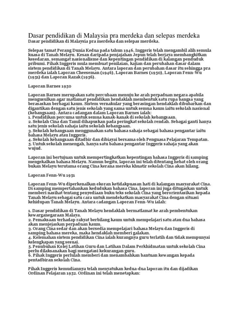 Doc Dasar Pendidikan Di Malaysia Pasca Kemerdekaan Hingga Abad Ke 20 Putih Kertas Academia Edu